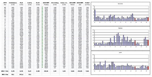 Sonntag, 16.10.11 – Die erste Trainingswoche 2012 ist eingetütet. Nach 5 Wochen des Rumgammelns, Durchhängens und Absackens ist es mehr als an der Zeit nun endlich wieder anzugreifen. Insbesondere mit Blick auf das Jahr 2011. Zum ersten Mal habe ich über ein volles Trainingsjahr hinweg jede einzelne Einheit akribisch notiert und das Ganze in Excel ausgewertet. Herausgekommen sind mit Mühe und Not gerade einmal 20,16 Stunden reine Trainingszeit im Jahresdurchschnitt ... Angestrebt und notwendig wären 30 Stunden. Besonders erschütternd sind die lediglich 217 Radkilometer pro Woche. 11 km im Wasser sind auch nicht sonderlich berauschend, aber wenigstens die 71 km Laufen gehen in Ordnung. Das Dumme dabei ist: ich war das ganze Jahr über am Limit. Das ist allerdings nicht unwesentlich auf meine diversen anderen Aktivitäten zurückzuführen. Hier ist insbesondere der Aufbau des cw.059 zu nennen, das mich neben einem Haufen Geld auch echte Unmengen an Zeit gekostet hat. Zeit die man als Berufstätiger, Ehemann und Vater halt nicht so einfach übrig hat. Nicht nur das Training, auch die Regeneration und letztlich die Wettkampfergebnisse haben darunter gelitten. Trotzdem: 217 km sind einfach indiskutabel, und da das Rad für 2012 nun fertig ist heißt die Devise: Radfahren, Radfahren, Radfahren sowie Kraft, Kraft, Kraft. 2012 trete ich lieber mit zwei kg zuviel an als mit einem halben kg zu wenig. Diese Woche habe ich mit 250 km zumindest einen guten Anfang gemacht, und um den Druck zu erhöhen poste ich meine Wochenkilometer ab jetzt immer Sonntags auf Facebook - einfach auf gefällt mir klicken und sehen ob ich's packe!