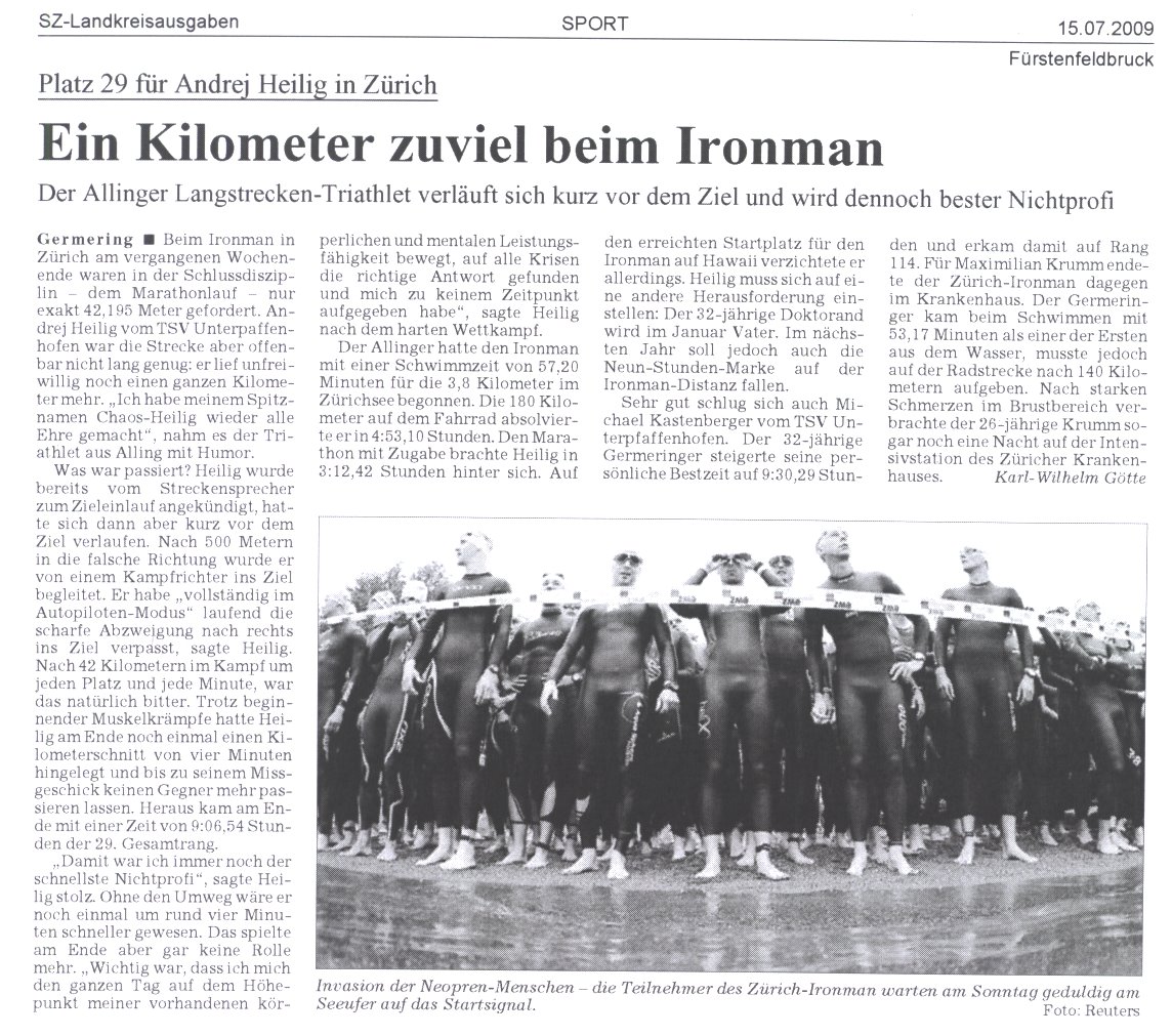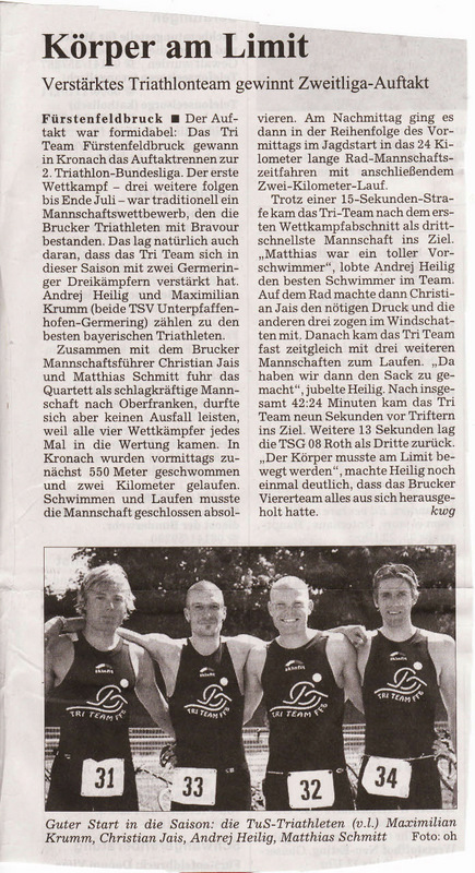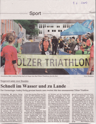 Mönchshof-Triathlon Kulmbach, 13.06.09 - 1. Platz und damit Bayerischer Meister über die Mitteldistanz. Bereits beim Schwimmen konnte ich den Rückstand auf die Spitzengruppe (in der ich mich bis Mitte der zweiten von drei Runden selber befand) gering halten, um mich dann beim Radfahren schnell an die Spitze zu setzen. Die Radstrecke in Kulmbach liegt mir einfach, da sie aufgrund der langgezogenen Anstiege und häufigen Richtungswechsel einen leichten, weniger kräftigen Athleten wie mich im Vergleich zu den typischen "Radmonstern" etwas bevorteilt. Ohne technischen Defekt oder Ernährungsprobleme ging ich nach einem schnellen Wechsel als Erster auf die Laufstrecke - eine Position, die ich von da an 20 km lang verteidigen musste. 20 km oder ca. 1:15 Std. sind eine laaaaange Zeit, in der man ständig an sich glauben muss und an seine Fähigkeit das Tempo auch bis zum Ende durchzuhalten. In einer solchen Position hängt der Erfolg nur von einem selber ab, und das Wissen darum macht die ganze Sache zu einer mental ziemlich quälenden Angelegenheit. Wenn es dann aber auf den letzten 2 - 3 km ENDLICH soweit ist dass eigentlich nichts mehr schief gehen kann, dann ist es schon ein Wahnsinnsgefühl den Erfolg sicher zu haben :-)!. |