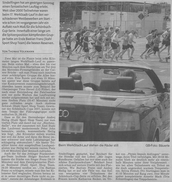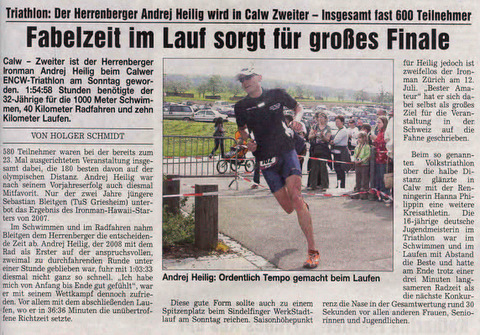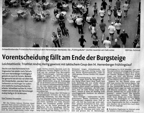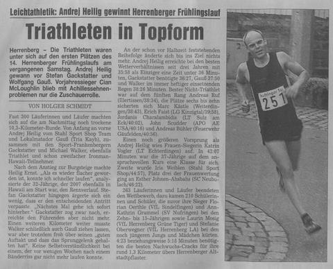 Herrenberger Frühlingslauf, 04.04.2009 - So wenig spannend der Rennverlauf für die im Zielbereich wartenden Zuschauer wohl war, so spannend war er für mich: bereits nach ca. 2 km, am Ende der langen Steigung hinauf zur Burg, als meine drei Begleiter Michael Walker (4.), Wolfgang Gauss (3.)und Stefan Gackstatter (2.) noch damit beschäftigt waren sich über das Ende des Antiegs zu freuen, habe ich mich mit einem konsequenten Antritt an die Spitze gesetzt und diese bis zum Schluss nicht mehr abgegeben. Auch für mich eine neue Erfahrung, aber aufgrund meiner Ausdauerleistungsfähigkeit als Ironman-Triathlet war ich doch zuversichtlich, das Tempo und den Vorsprung auch bis zum Ende halten zu können. Aber es ist halt erst vorbei wenn es vorbei ist, und bis dahin habe ich schon ordentlich geschwitzt :-). Bloß nicht nachlassen, nicht müde werden, konzentriert bleiben, es sich nicht zum Schluss noch nehmen lassen … das waren die Gedanken die mich auf den letzten Kilometern beschäftigt haben. Besonders schön war es eine Reihe von Bekannten an der Strecke und im Ziel zu sehen – DANKE für die Unterstützung! |